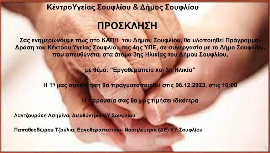 Οι εκδηλώσεις θα πραγματοποιηθούν στον χώρο του ΚΑΠΗ Σουφλίου αύριο Παρασκευή 8 Δεκεμβρίου 2023 και στις 10:00 και 11:00 το πρωί από το Κέντρο Υγείας Σουφλίου σε συνεργασία με τον Δήμο Σουφλίου.