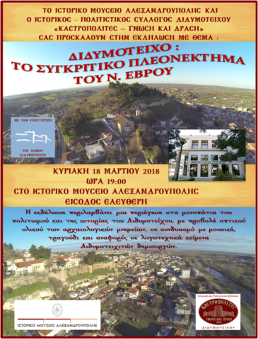 Το Ιστορικό Μουσείο Αλεξανδρούπολης και ο Ιστορικός – Πολιτιστικός Σύλλογος Διδυμοτείχου “Καστροπολίτες – Γνώση και Δράση”, σας προσκαλούν την Κυριακή 18 Μαρτίου 2018 και ώρα 19:00 στην εκδήλωση που θα πραγματοποιηθεί στο χώρο του Μουσείου με θέμα: “ΔΙΔΥΜΟΤΕΙΧΟ, ΤΟ ΣΥΓΚΡΙΤΙΚΟ ΠΛΕΟΝΕΚΤΗΜΑ ΤΟΥ Ν. ΕΒΡΟΥ”.