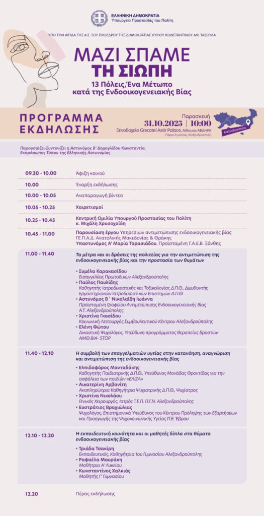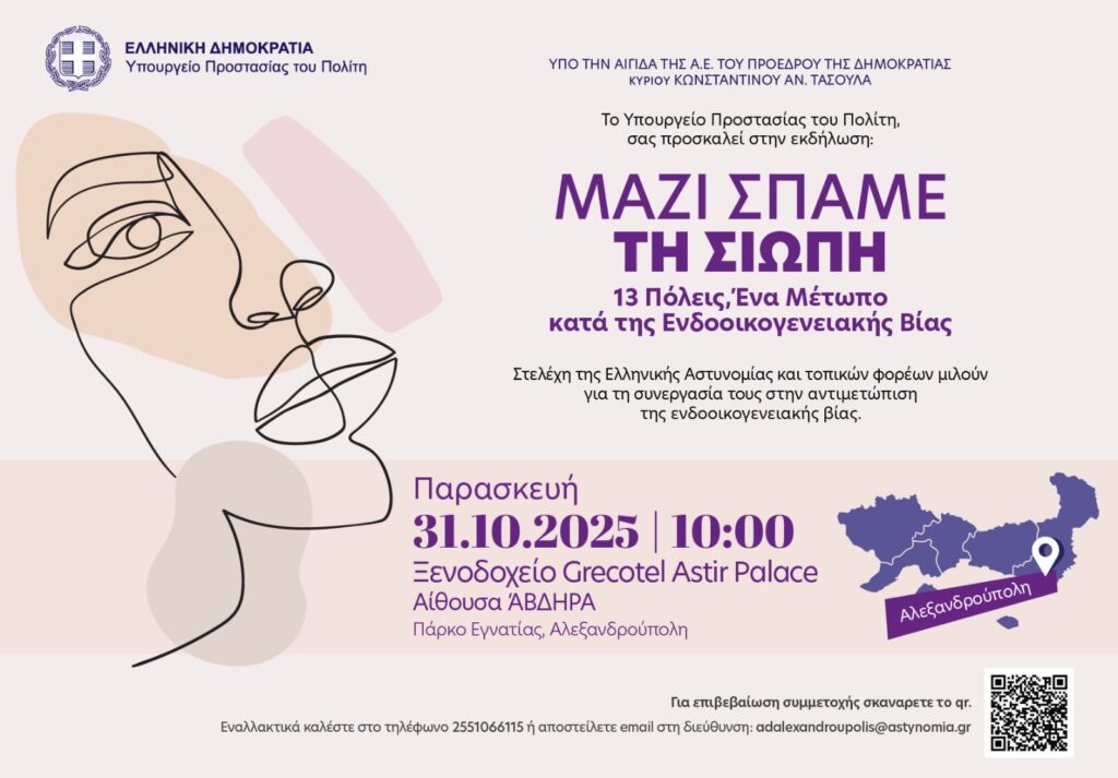Το Υπουργείο Προστασίας του Πολίτη, στο πλαίσιο της δράσης «Μαζί σπάμε τη σιωπή. 13 Πόλεις: Ένα μέτωπο κατά της ενδοοικογενειακής βίας», διοργανώνει εκδήλωση στην Αλεξανδρούπολη, την Παρασκευή 31 Οκτωβρίου 2025.