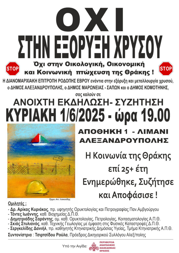 “Τελευταίες Εξελίξεις στην Εξόρυξη Χρυσού στη Θράκη”, την Κυριακή 1 Ιουνίου 2025 και ώρα: 19:00 στην Αποθήκη 1 – Λιμάνι Αλεξανδρούπολης.