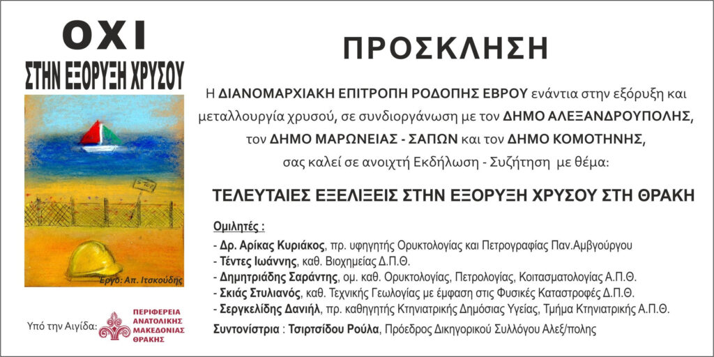 Οι Δήμοι Αλεξανδρούπολης, Μαρωνείας-Σαπών και Κομοτηνής και η Διανομαρχιακή Επιτροπή Ροδόπης- Έβρου ενάντια στην εξόρυξη και τη μεταλλουργία χρυσού σας προσκαλούν σε ανοιχτή εκδήλωση – συζήτηση με θέμα: