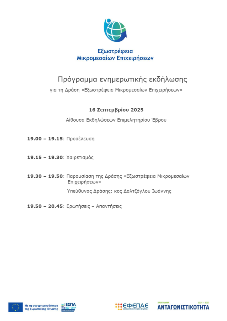 Το Υποκατάστημα του ΕΦΕΠΑΕ στην Περιφέρεια Ανατολικής Μακεδονίας και Θράκης, σε συνεργασία με το Επιμελητήριο Έβρου, το Εμπορικό και Βιομηχανικό Επιμελητήριο Ροδόπης, το Επαγγελματικό και Βιοτεχνικό Επιμελητήριο Ροδόπης, το επιμελητήριο Ξάνθης και τον Σύνδεσμο Εξαγωγέων (ΣΕΒΕ), σας προσκαλούν στην ανοικτή ενημερωτική εκδήλωση που διοργανώνουν με θέμα την παρουσίαση της Δράσης του Προγράμματος «Ανταγωνιστικότητα 2021-2027»: «Εξωστρέφεια Μικρομεσαίων Επιχειρήσεων» στις 16/09/2025, ώρα: 19:00 στην Αίθουσα εκδηλώσεων του Επιμελητηρίου Έβρου – Λ. Δημοκρατίας 307, Αλεξανδρούπολη
