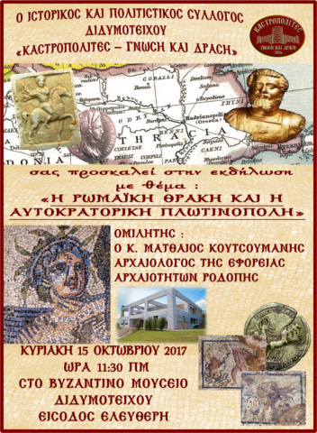 Ο Ιστορικός και Πολιτιστικός Σύλλογος Διδυμοτείχου «ΚΑΣΤΡΟΠΟΛΙΤΕΣ – Γνώση και Δράση», σας προσκαλεί στην εκδήλωση με θέμα: «Η Ρωμαϊκή Θράκη και η Αυτοκρατορική Πλωτινόπολη».