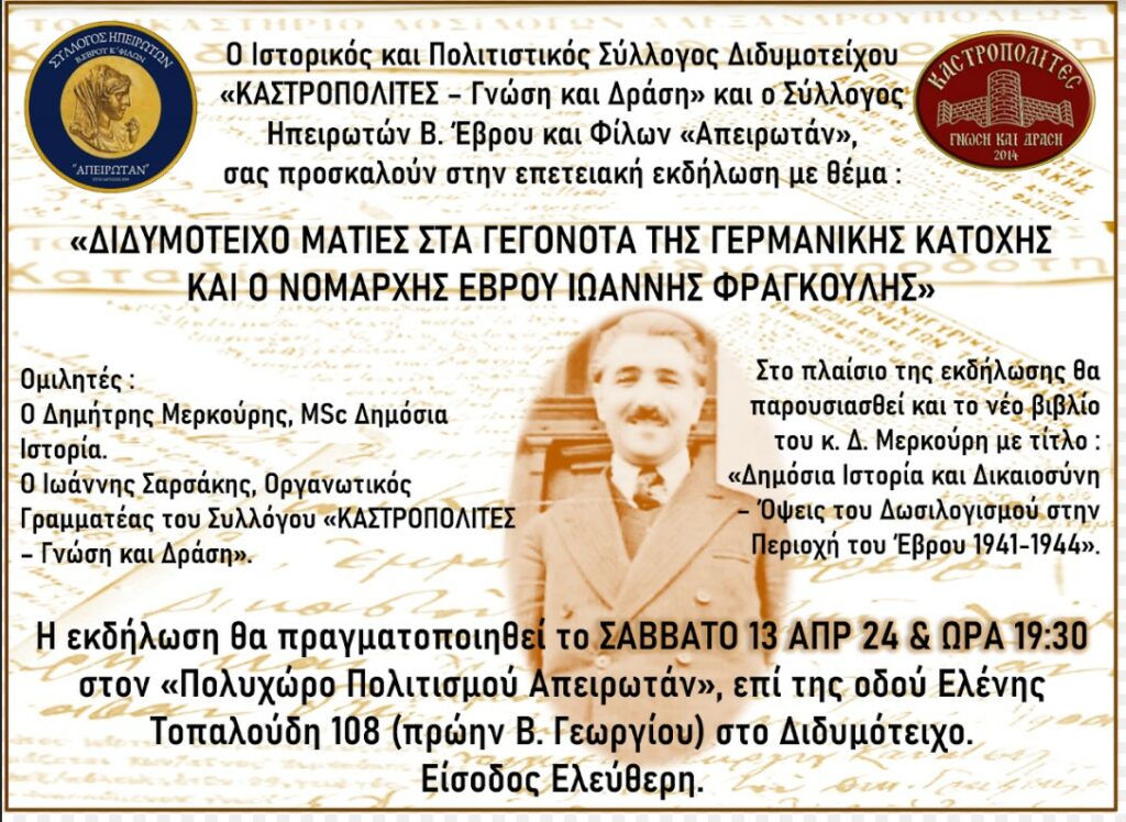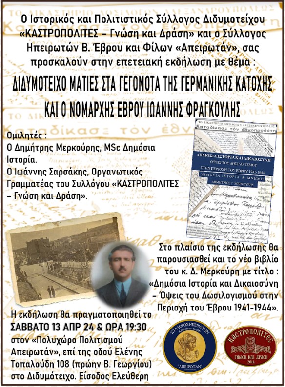Ο Ιστορικός και Πολιτιστικός Σύλλογος Διδυμοτείχου «ΚΑΣΤΡΟΠΟΛΙΤΕΣ – Γνώση και Δράση» και ο Σύλλογος Ηπειρωτών Β. Έβρου και Φίλων «Απειρωτάν», σας προσκαλούν στην επετειακή εκδήλωση με θέμα : «Διδυμότειχο ματιές στα γεγονότα της Γερμανικής κατοχής και ο νομάρχης Έβρου Ιωάννης Φραγκούλης».
