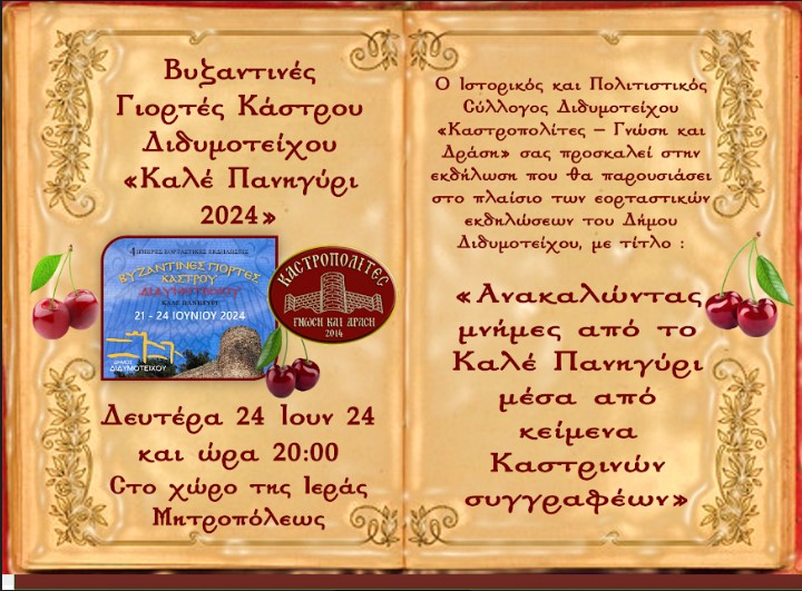 Ο Ιστορικός και Πολιτιστικός Σύλλογος Διδυμοτείχου «Καστροπολίτες – Γνώση και Δράση», στο πλαίσιο των εορταστικών εκδηλώσεων του Δήμου Διδυμοτείχου Βυζαντινές Γιορτές Κάστρου Διδυμοτείχου «Καλέ Πανηγύρι 2024», σας προσκαλεί στην εκδήλωση που θα παρουσιάσει, με τίτλο : «Ανακαλώντας Μνήμες από το Καλέ Πανηγύρι μέσα από Κείμενα Καστρινών Συγγραφέων»