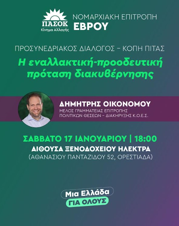Εκδήλωση της Ολομέλειας του ΠΑΣΟΚ- Κινήματος Αλλαγής Ν. Έβρου και κοπή πίτας θα πραγματοποιηθεί στην Ορεστιάδα το Σάββατο 17 Ιανουαρίου 2026 παρουσία του Δημήτρη Οικονόμου, μέλος της Γραμματείας Επιτροπής Πολιτικών Θέσεων – Διακήρυξης Κ.Ο.Ε.Σ.