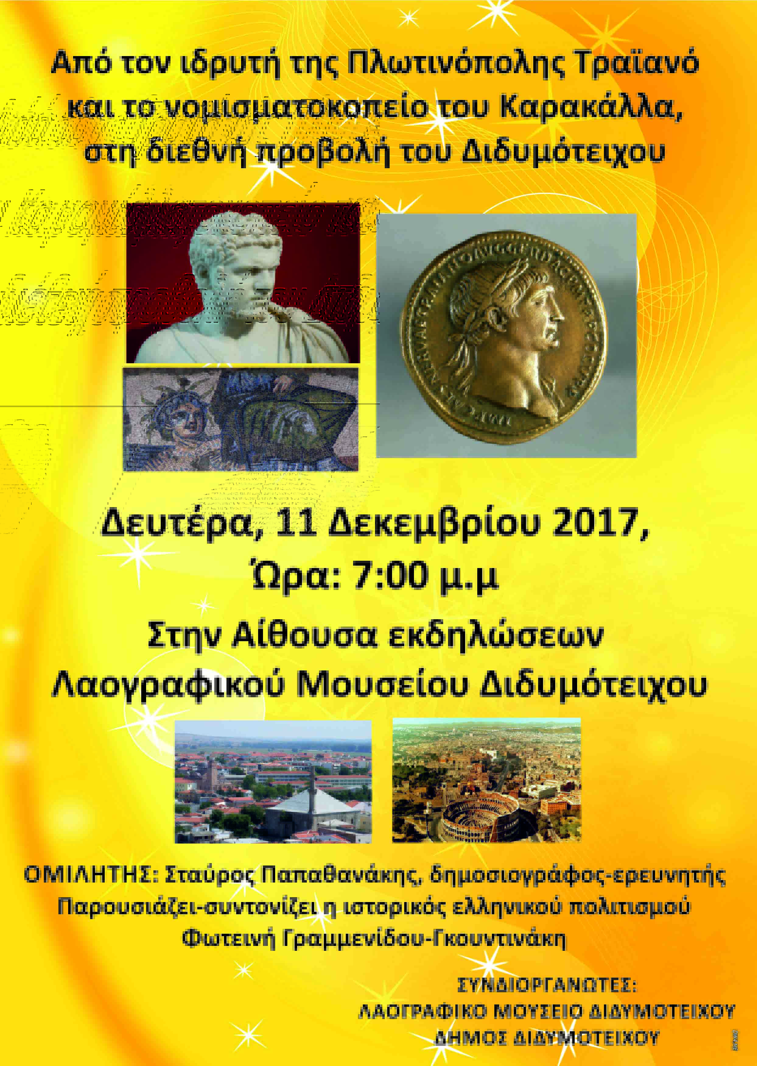 Εκδήλωση με θέμα «Από τον ιδρυτή της Πλωτινόπολης Τραϊανό και το νομισματοκοπείο του Καρακάλλα στη διεθνή προβολή του Διδυμοτείχου» στο Λαογραφικό Μουσείο Διδυμοτείχου