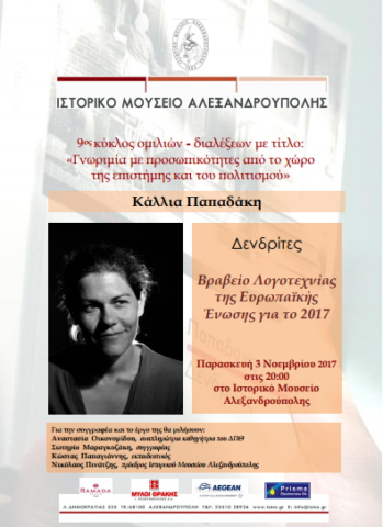 Στα πλαίσια του 9ου κύκλου ομιλιών και διαλέξεων με τίτλο «Γνωριμία με προσωπικότητες από τον χώρο της επιστήμης και του πολιτισμού» το Ιστορικό Μουσείο Αλεξανδρούπολης διοργανώνει εκδήλωση προς τιμήν της βραβευμένης συγγραφέα Κάλλιας Παπαδάκη.