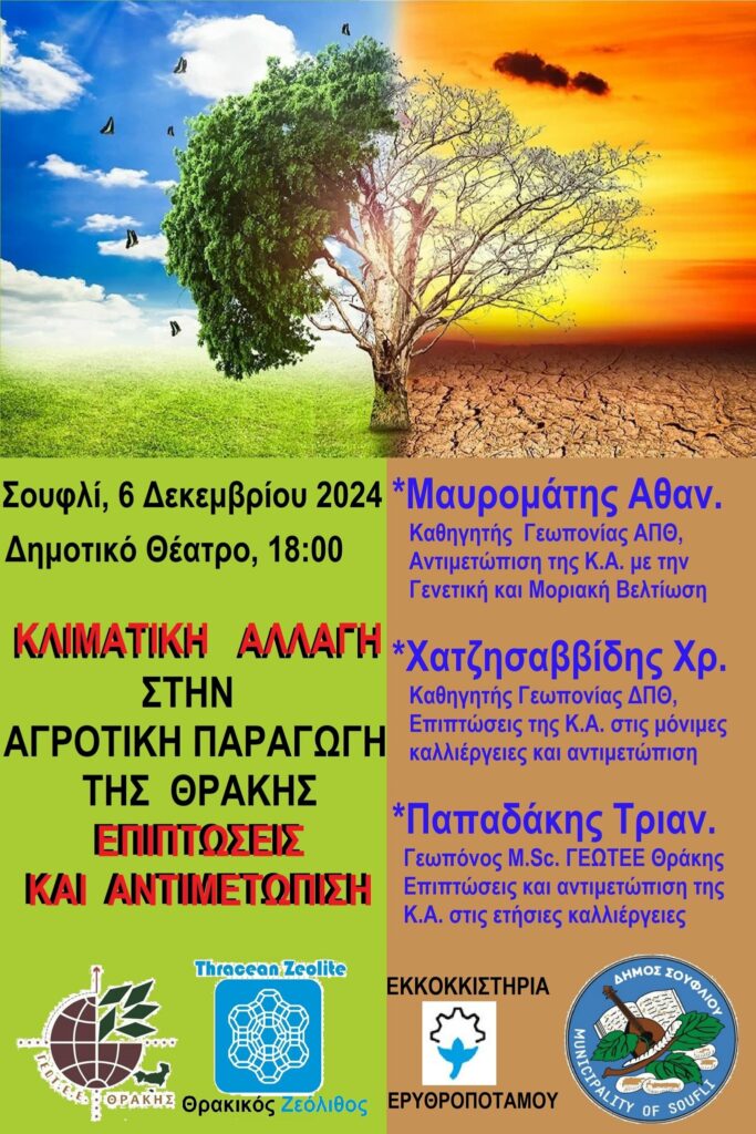 Ο Δήμος Σουφλίου σας προσκαλεί την Παρασκευή 6 Δεκεμβρίου 2024, στις 18:00 στην ενημερωτική εσπερίδα με θέμα «Κλιματική αλλαγή στην αγροτική παραγωγή της Θράκης: επιπτώσεις και αντιμετώπιση» που διοργανώνει σε συνεργασία με το Γεωτεχνικό Επιμελητήριο Ελλάδος (ΓΕΩΤΕΕ) – Παράρτημα Θράκης στο Δημοτικό Θέατρο Σουφλίου με ομιλητές τους: