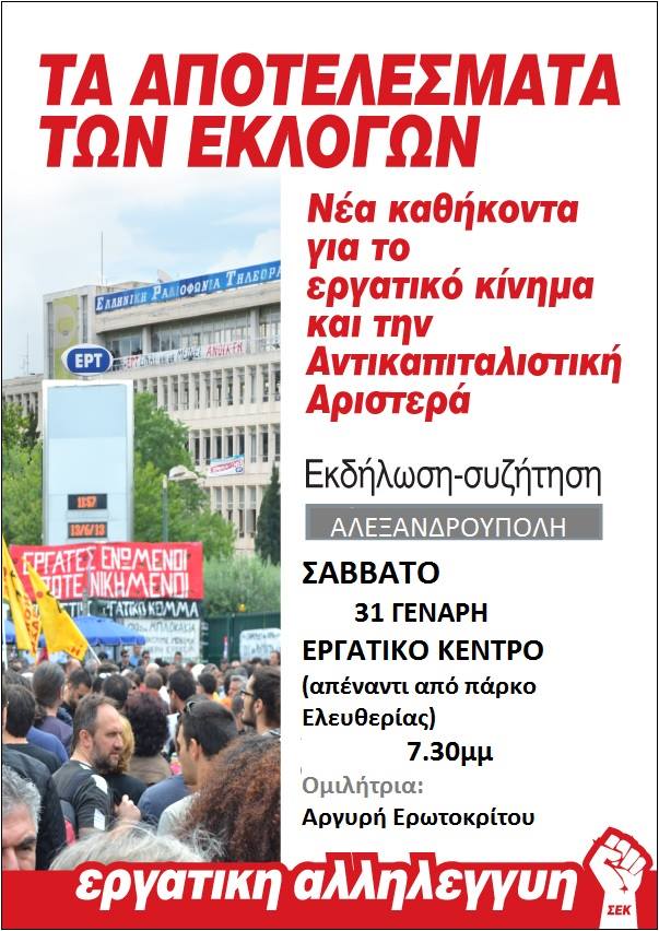 Εκδήλωση στην οποία θα συζητηθεί το αποτέλεσμα των εκλογών και η περαιτέρω δράση της αριστεράς διοργανώνει η Εργατική Αλληλεγγύη το Σάββατο 31 Ιανουαρίου στις 19:30 στο Εργατικό Κέντρο Αλεξανδρούπολης (απέναντι από το το πάρκο Ελευθερίας) με κεντρική ομιλήτρια την Αργυρή Ερωτοκρίτου.Η ανακοίνωση της διοργάνωσης: