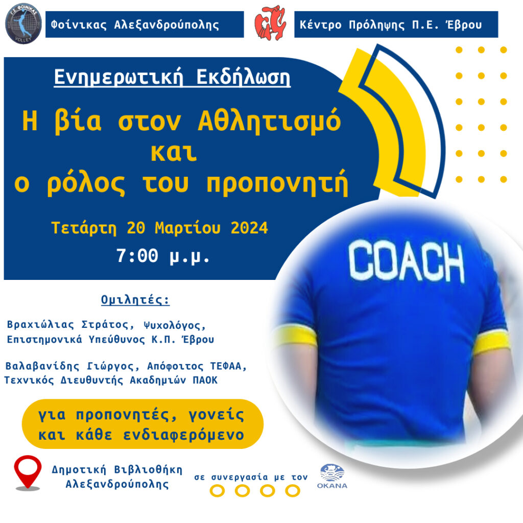 Η ενημερωτική εκδήλωση με τίτλο: «Η βία στον Αθλητισμό και ο ρόλος του προπονητή» θα πραγματοποιηθεί την Τετάρτη 20/03/2024 στις 7:00 μ.μ., στην Δημοτική Βιβλιοθήκη Αλεξανδρούπολης.