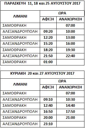 Τα έκτακτα δρομολόγια που θα εκτελεσθούν είναι: από Σαμοθράκη προς Αλεξανδρούπολη ώρα 19:30 μ.μ για τις ημέρες Παρασκευή 11, 18 και 25 Αυγούστου και από Αλεξανδρούπολη προς Σαμοθράκη ώρα 22:40 μ.μ. Επίσης για την Κυριακή 20 και 27 Αυγούστου από Σαμοθράκη προς Αλεξανδρούπολη ώρα 07:00 π.μ. και από Αλεξανδρούπολη προς Σαμοθράκη ώρα 10:30 π.μ.