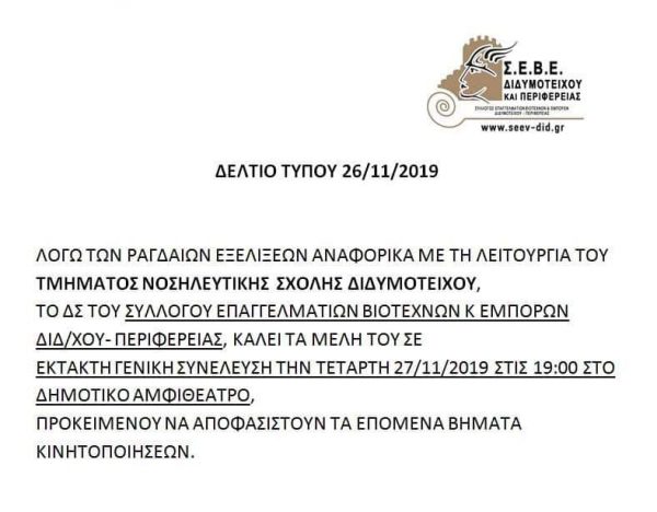 Σε έκτακτη γενική συνέλευση καλεί τα μέλη του ο Εμπορικός Σύλλογος Διδυμοτείχου μετά τις ραγδαίες εξελίξεις αναφορικά με την λειτουργία της Νοσηλευτικής Σχολής