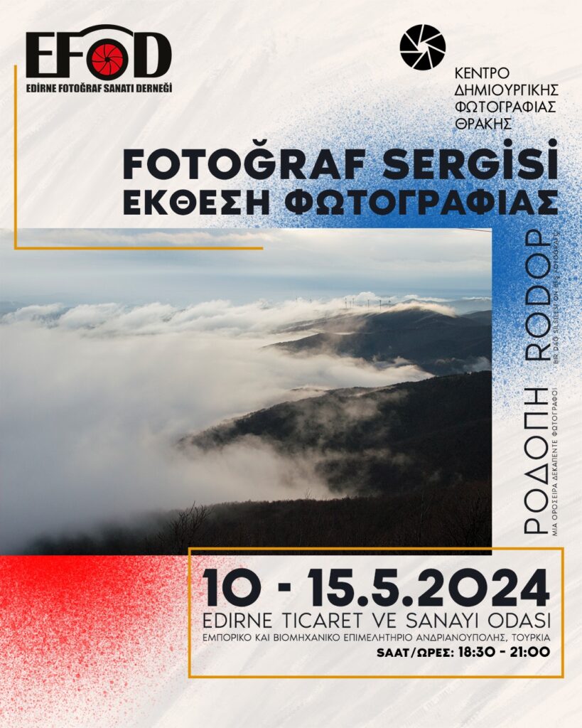 Ο Φωτογραφικός Σύλλογος Αδριανούπολης (Efod Edirne) και το Κέντρο Δημιουργικής Φωτογραφίας Θράκης σας προσκαλούν στα εγκαίνια μιας ξεχωριστής Ομαδικής Έκθεσης Φωτογραφίας, με τίτλο: «ΡΟΔΟΠΗ: Μια οροσειρά Δεκαπέντε φωτογράφοι», που θα πραγματοποιηθούν την Παρασκευή 10 Μαΐου 2024 στις 18:30 στο Εμπορικό και Βιομηχανικό Επιμελητήριο Αδριανούπολης, στην Τουρκία.