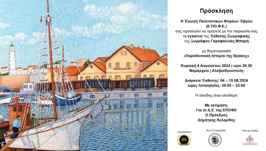Η Ένωση Πολιτιστικών Φορέων Έβρου [Ε.ΠΟ.Φ.Ε.] σας προσκαλεί να τιμήσετε με την παρουσία σας τα εγκαίνια της Έκθεσης Ζωγραφικής της εικαστικού Γαρυφαλλιάς Μπαρή με θεματογραφία «Παραδοσιακή Ιστορία της Θράκης»