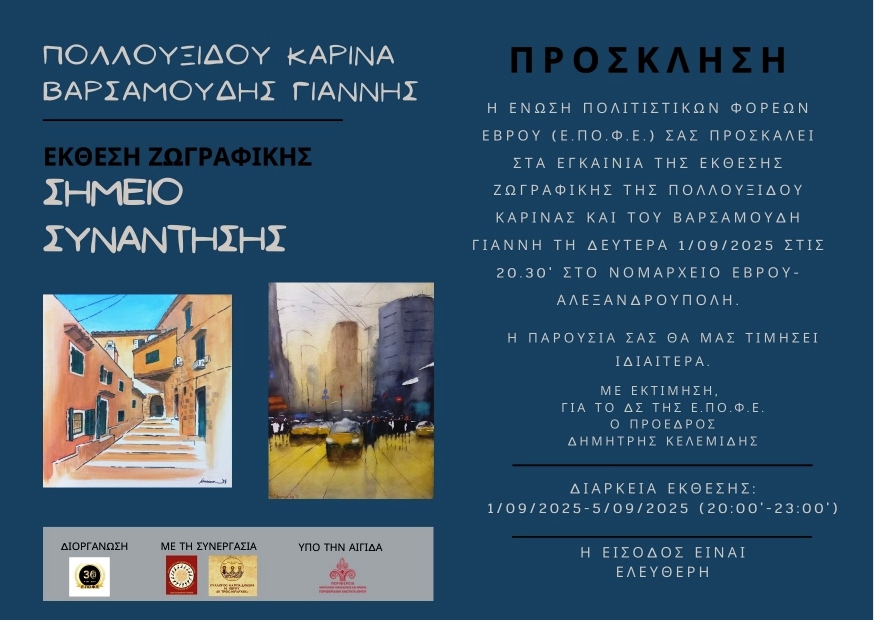 Η Ε.ΠΟ.Φ.Ε. | Ένωση Πολιτιστικών Φορέων Έβρου σας καλεί να τιμήσετε με την παρουσία σας την Έκθεση Ζωγραφικής των ζωγράφων Καρίνας Πολλουξίδου και Γιάννη Βαρσαμούδη με θεματογραφία «ΣΗΜΕΙΟ ΣΥΝΑΝΤΗΣΗΣ»