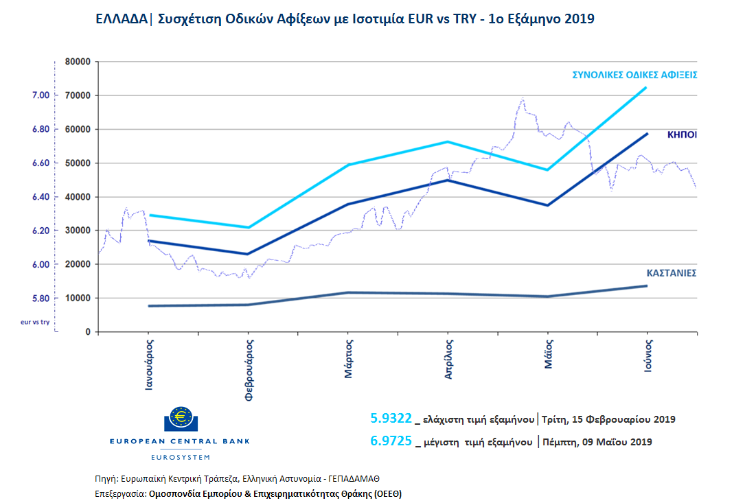 Κατά τους δύο πρώτους μήνες του 2019 οι ρυθμοί των τουρκικών αφίξεων είναι αρνητικοί, τον Μάρτιο παρατηρείται αύξηση, ακολουθεί ένα διάστημα δύο μηνών όπου οι αφίξεις είναι οριακά αμετάβλητες συγκριτικά με το 2018, ενώ εκτίναξη των αφίξεων με 14.000 νέες εισόδους και 72.500 συνολικά να καταγράφονται τον Ιούνιο, μήνα λήξης για το 2019 του Ραμαζανιού.