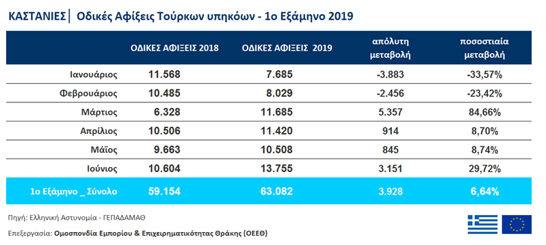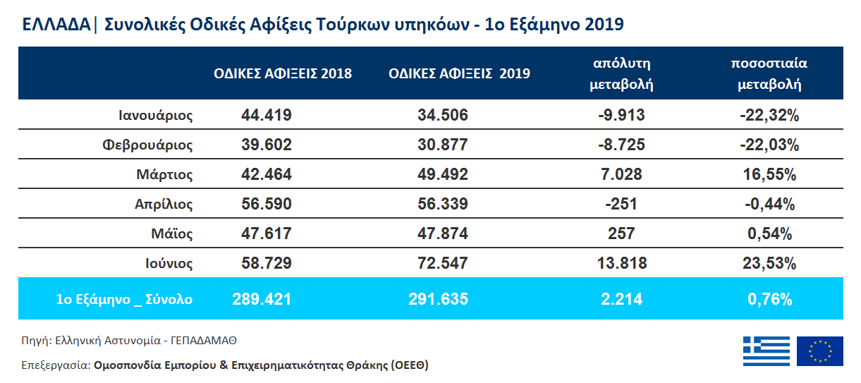 Σε επίπεδο εξαμήνου δεν υφίστανται ιδιαίτερες μεταβολές στο τρέχον έτος σε σχέση με το πρώτο εξάμηνο του 2018 με την καταγραφή των στοιχείων να δίδει οριακή βελτίωση της τάξεως του 0,76% και περισσότερους από διακόσιες ενενήντα χιλιάδες Τούρκους (291.635) να εισέρχονται στην Ελλάδα από τις δύο οδικές πύλες εισόδου στο Νομό Έβρου.