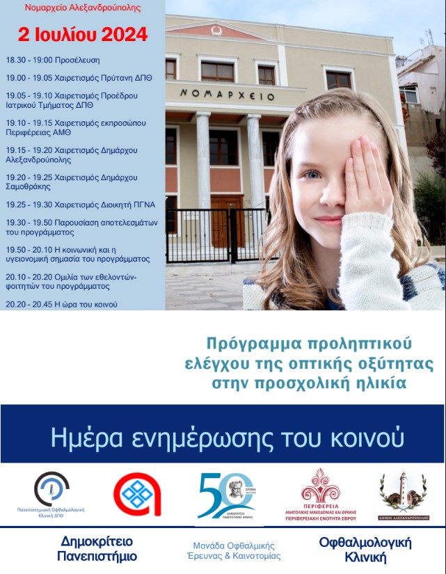 διεξαχθεί η ετήσια ενημερωτική εκδήλωση του προγράμματος «Προληπτικός έλεγχος της οπτικής οξύτητας στην προσχολική ηλικία» που διοργανώνεται από την Πανεπιστημιακή Οφθαλμολογική Κλινική του Πανεπιστημιακού Γενικού Νοσοκομείου Αλεξανδρούπολης.