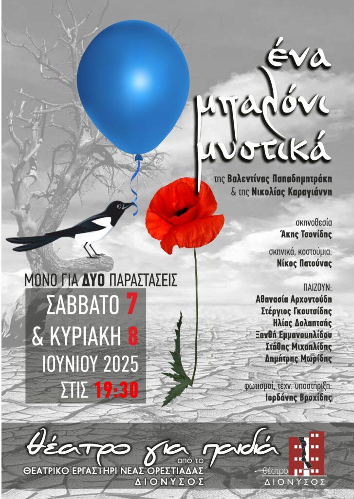 Πρόκειται για το πρωτότυπο έργο της Βαλεντίνας Παπαδημητράκη και της Νικολίας Καραγιάννη “Ένα μπαλόνι μυστικά”, που γράφτηκε και πρωτοπαρουσιάστηκε το 2008 από το “Θέατρο του παπουτσιού πάνω στο δέντρο” και αφιλοκερδώς προσέφεραν οι δημιουργοί στο Θεατρικό Εργαστήρι Νέας Ορεστιάδας ΔΙΟΝΥΣΟΣ.