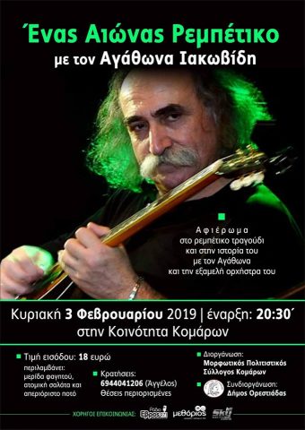 Ο Μορφωτικός Σύλλογος Κομάρων ξεκινάει το 2019 με ένα μεγάλο γλέντι, αφιερωμένο στο ρεμπέτικο τραγούδι και την ιστορία του. Το γλέντι θα πραγματοποιηθεί την Κυριακή 3 Φεβρουαρίου 2019 και ώρα 20:30 στην κοινότητα Κομάρων, με τον Αγάθωνα Ιακωβίδη και την εξαμελή ορχήστρα του. Την εκδήλωση συνδιοργανώνουν ο Μορφωτικός Σύλλογος Κομάρων και ο Δήμος Ορεστιάδας. Κρατήσεις θέσεων απαραίτητες (λόγω περιορισμένου αριθμού). Τηλέφωνο επικοινωνίας: 6944041206 (Άγγελος). Τιμή εισόδου: 18 ευρώ (στην τιμή συμπεριλαμβάνεται μερίδα φαγητού, ατομική σαλάτα και απεριόριστο ποτό). Χορηγός επικοινωνίας είναι το Ράδιο Έβρος!