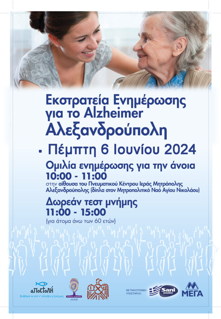 Η Ιερά Μητρόπολη Αλεξανδρουπόλεως σε συνεργασία με την «Ολοκληρωμένη Μονάδα Αντιμετώπισης νόσου Alzheimer» του Φιλανθρωπικού Οργανισμού ΑΠΟΣΤΟΛΗ της Ιεράς Αρχιεπισκοπής Αθηνών, πραγματοποιούν την Πέμπτη 6 Ιουνίου από 10.00’ το πρωί μέχρι τις 3.00’ το μεσημέρι, στο Πνευματικό Κέντρο της Μητροπόλεως (παραπλεύρως του Μητροπολιτικού Ναού), «Εκστρατεία ενημέρωσης και πρόληψης για το Alzheimer».