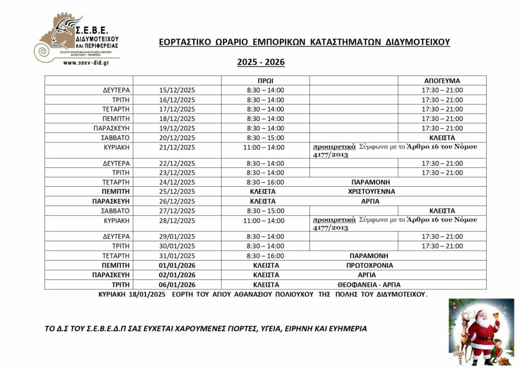 Ο Εμπορικός Σύλλογος Διδυμοτείχου ενημερώνει το καταναλωτικό κοινό ότι, ενόψει των εορτών, τα εμπορικά καταστήματα της πόλης θα λειτουργήσουν με το παρακάτω εορταστικό ωράριο