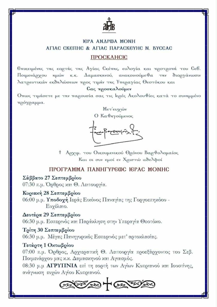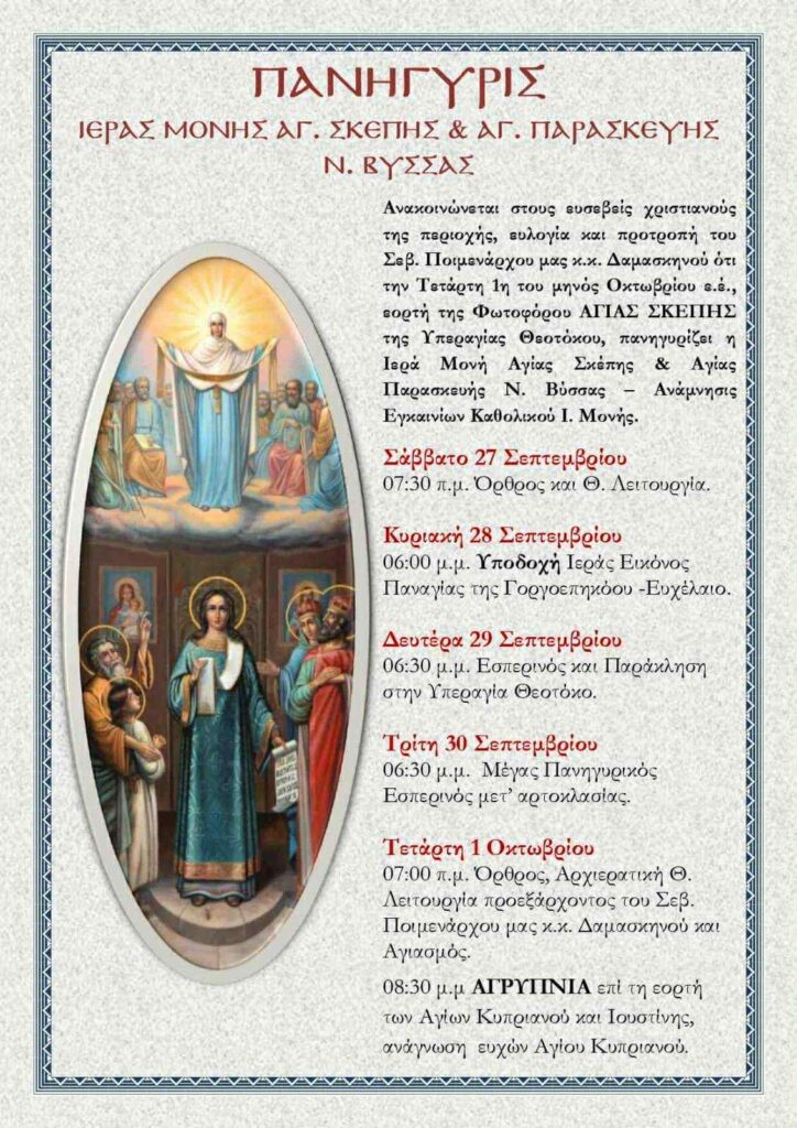 Με ευλάβεια και τιμή ετοιμάζεται να τιμήσει η Ιερά Μονή Αγίας Σκέπης και Αγίας Παρασκευής στη Νέα Βύσσα την εορτή της Αγίας Σκέπης της Υπεραγίας Θεοτόκου, μέσα από ένα πολυήμερο πρόγραμμα λατρευτικών και πολιτιστικών εκδηλώσεων.