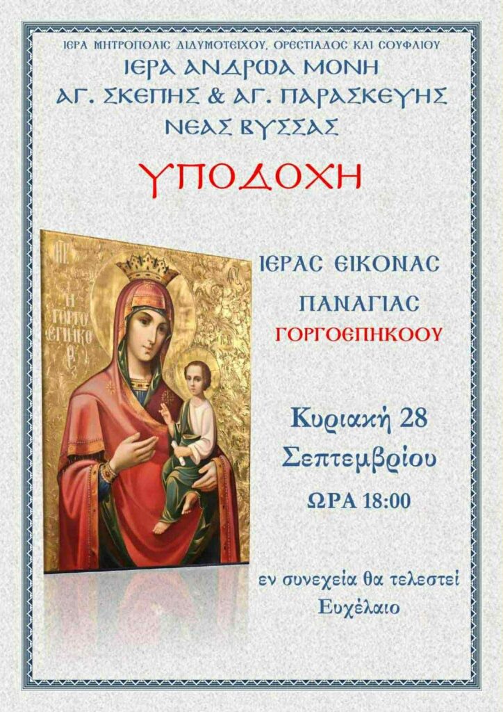Από το Σάββατο 27 Σεπτεμβρίου έως και τη Τρίτη 1 Οκτωβρίου στην Ιερά Μονή Αγίας Σκέπης και Αγίας Παρασκευής το πρόγραμμα περιλαμβάνει Ιερές Ακολουθίες, την υποδοχή της ιεράς εικόνας Παναγίας Γοργοεπηκόου, αλλά και μια μουσική εκδήλωση – αφιέρωμα στους δυο σπουδαίους εκφραστές της θρακιώτικης παραδοσιακής μουσικής.