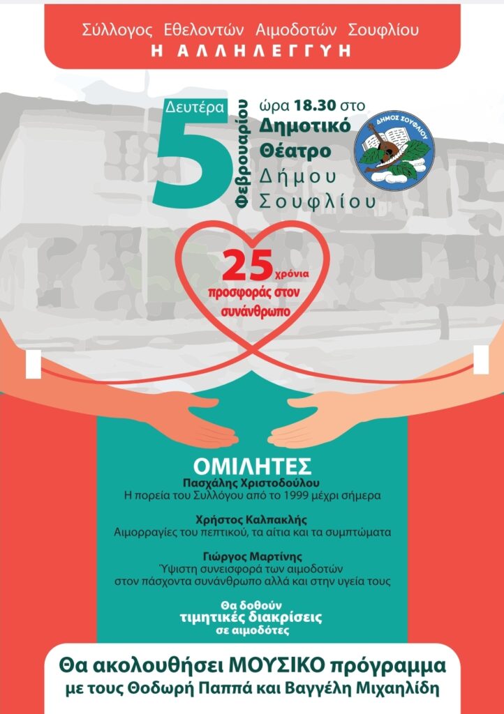 Επετειακή εκδήλωση για τα 25 χρόνια από την ίδρυσή του διοργανώνει σήμερα, Δευτέρα 5 Φεβρουαρίου ο Σύλλογος Εθελοντών Αιμοδοτών Σουφλίου «Η Αλληλεγγύη».