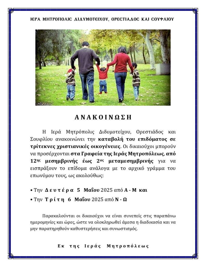 Η Ιερά Μητρόπολη Διδυμοτείχου, Ορεστιάδος και Σουφλίου ανακοινώνει την καταβολή του επιδόματος σε τρίτεκνες χριστιανικές οικογένειες. Οι δικαιούχοι μπορούν να προσέλθουν στα Γραφεία της Ιεράς Μητροπόλεως , από 12 ης μεσημβρινής έως 2 ως μεταμεσημβρινής για να εισπράξουν το επίδομα ανάλογα με το αρχικό γράμμα του επωνύμου τους, ως ακολούθως: