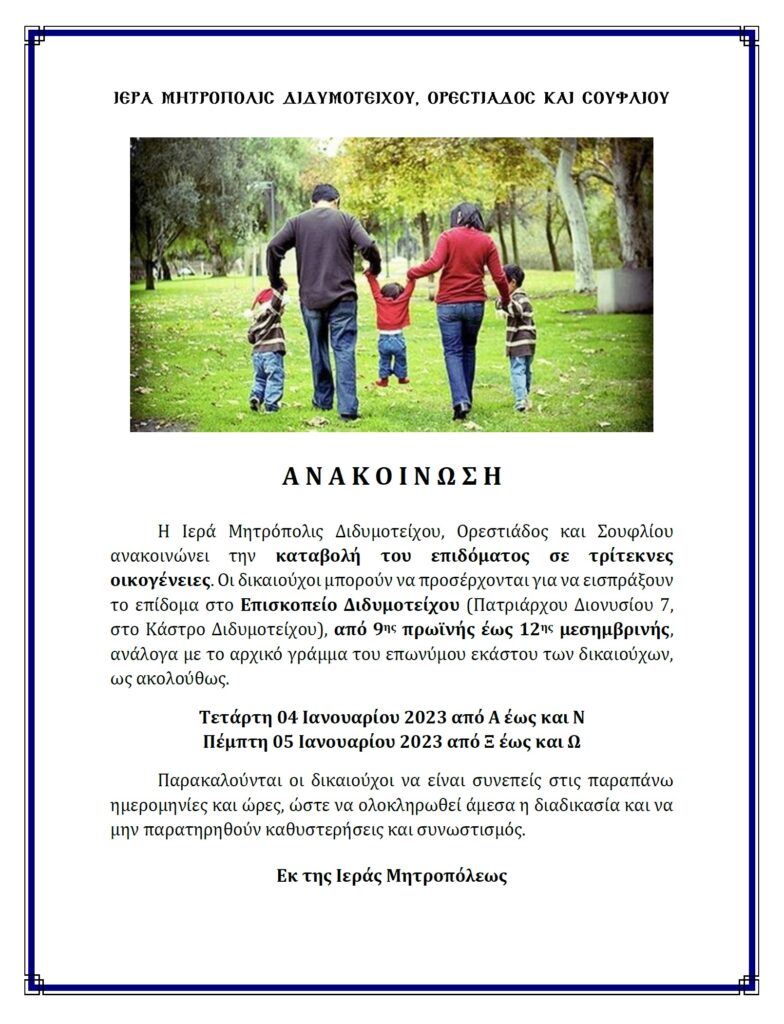 Η Ιερά Μητρόπολις Διδυμοτείχου, Ορεστιάδος και Σουφλίου ανακοινώνει την καταβολή του επιδόματος σε τρίτεκνες οικογένειες. Οι δικαιούχοι μπορούν να προσέρχονται για να εισπράξουν το επίδομα στο Επισκοπείο Διδυμοτείχου (Πατριάρχου Διονυσίου 7, στο Κάστρο Διδυμοτείχου), από τις 9 το πρωί έως τις 12 το μεσημέρι την Τετάρτη και την Πέμπτη, ανάλογα με το αρχικό γράμμα του επωνύμου τους, ως ακολούθως: