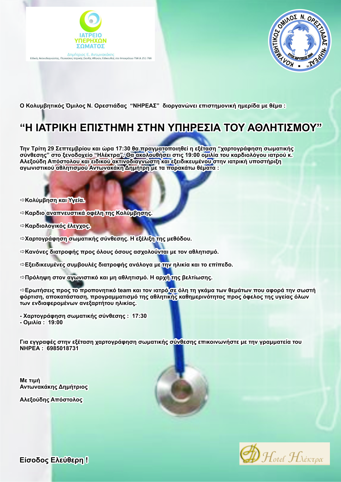 Την Τρίτη 29 Σεπτεμβρίου και ώρα 17:30 θα πραγματοποιηθεί η εξέταση ‘χαρτογράφηση σωματικής σύνθεσης’ στο ξενοδοχείο ‘Ηλέκτρα’. Θα ακολουθήσει στις 19:00 ομιλία του καρδιολόγου ιατρού κ. Αλεξούδη Απόστολου και ειδικού ακτινοδιαγνώστη και εξειδικευμένου στην ιατρική υποστήριξη αγωνιστικού αθλητισμού Αντωνακάκη Δημήτρη με τα παρακάτω θέματα :