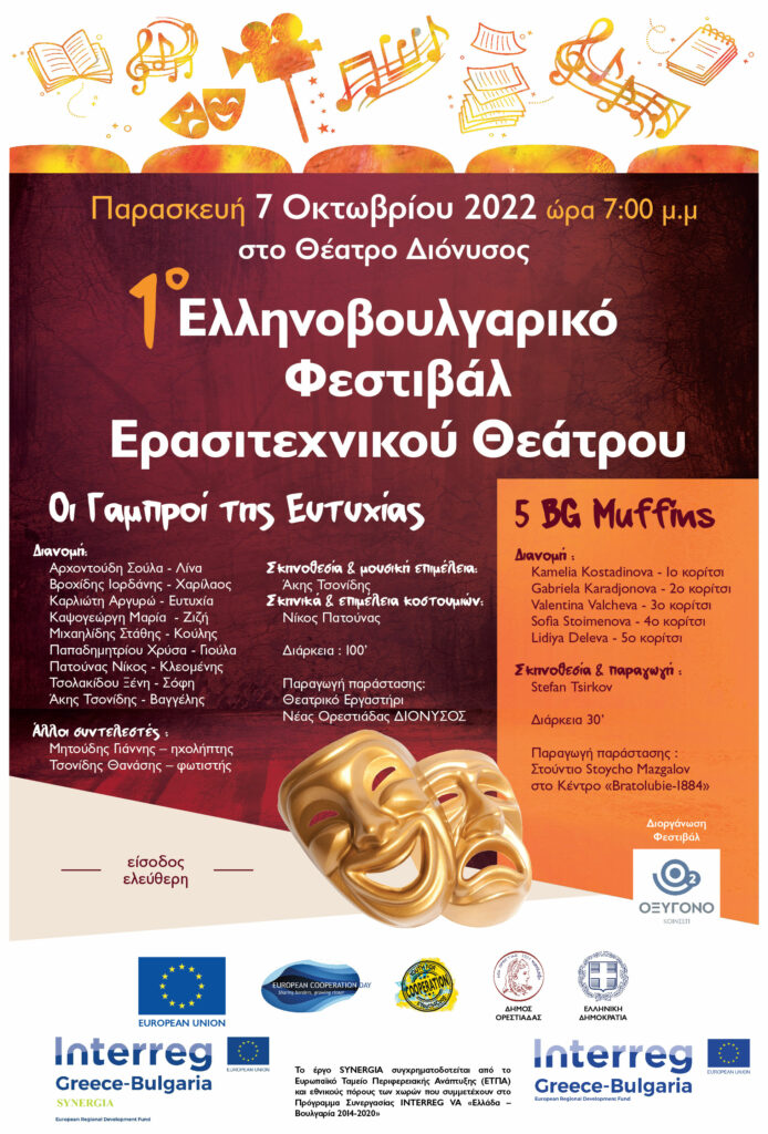 Το βράδυ της ίδιας ημέρας «κάνει πρεμιέρα» το 1ο Φεστιβάλ Ελληνοβουλγαρικού Ερασιτεχνικού Θεάτρου, το οποίο υλοποιεί ο Δήμος Ορεστιάδας μαζί με τον Δήμο του Lyubimets. Από την Ελλάδα θα παρουσιαστεί το έργο «Οι Γαμπροί της Ευτυχίας» από το Θεατρικό Εργαστήρι Νέας Ορεστιάδας ΔΙΟΝΥΣΟΣ, ενώ από τη Βουλγαρία θα γίνει η προβολή του βίντεο της θεατρικής παράστασης «5 BG Muffins» που οργανώθηκε από το κοινωνικό κέντρο Bratolubie – 1884 Lyubimets. Οι παραστάσεις θα παρουσιαστούν στις 7 μ.μ. στο Θέατρο Διόνυσος και η είσοδος είναι ελεύθερη για το κοινό.