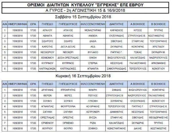 Ανακοινώθηκαν χθες το απόγευμα οι διαιτητές που θα σφυρίξουν τον δεύτερο επίσημο αγώνα για τις ομάδες της ΕΠΣ Έβρου, στην 2η αγωνιστική της Α΄Φάσης. Δείτε αναλυτικά στον παρακάτω πίνακα: