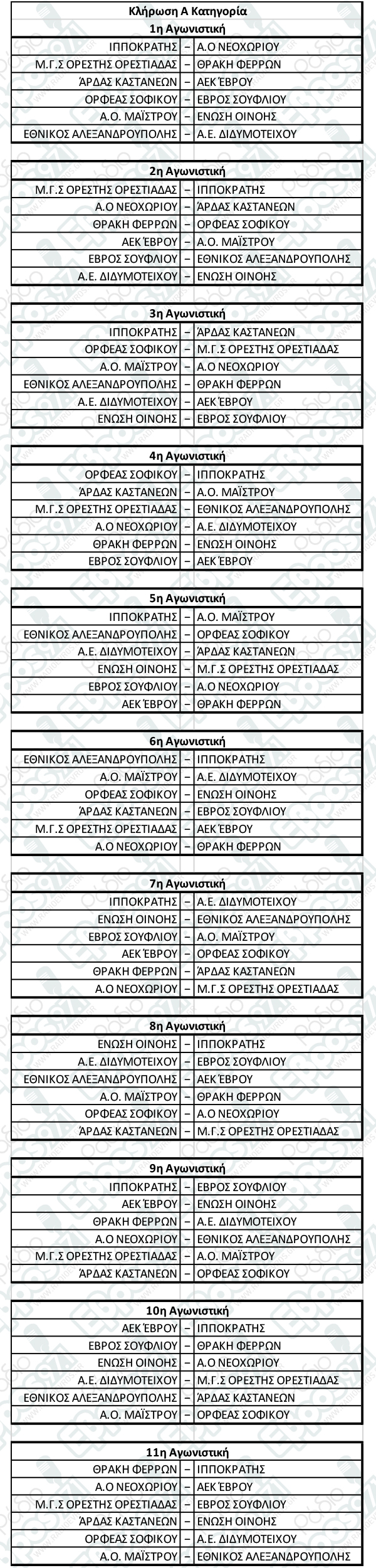 Πρωτάθλημα Α΄Κατηγορίας ΕΠΣ Έβρου Ομάδες: Ορέστης Ορεστιάδας, Εθνικός Αλεξανδρούπολης, Ιπποκράτης,Έβρος Σουφλίου, Α.Ε.Διδυμοτείχου, Θράκη Φερών, Άρδας Καστανεών, ΑΕΚ Έβρου, Ορφέας Σοφικού, Α.Ο.Νεοχωρίου, Α.Ο.Μαΐστρου, Ένωση Οινόης.