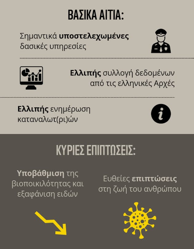 Οι ελληνικές Αρχές παρουσιάζουν έλλειμμα ως προς τη συλλογή και ανάλυση δεδομένων από ιδιωτικούς και δημόσιους φορείς που εμπλέκονται στην αντιμετώπιση του παράνομου και ανεξέλεγκτου εμπορίου άγριων ειδών.