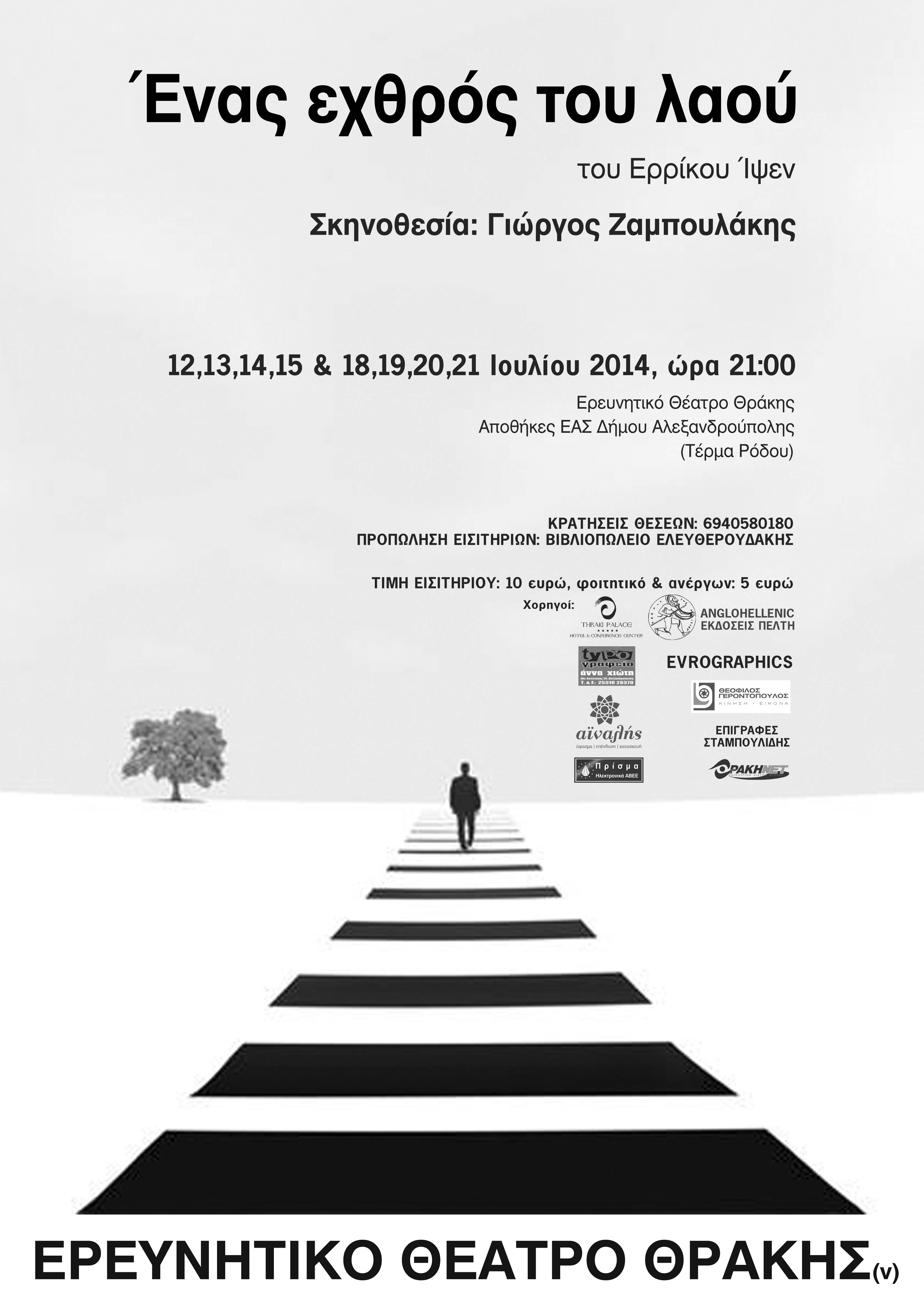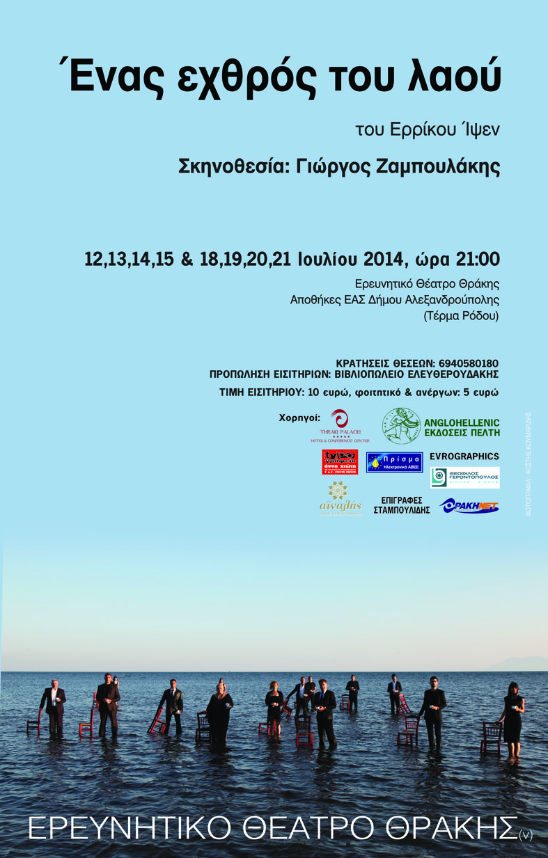 Το Ερευνητικό Θέατρο Θράκης σας προσκαλεί στην παράσταση “Ένας Εχθρός του Λαού” Ερρίκου Ίψεν σε σκηνοθεσία Γιώργου Ζαμπουλάκη που θα παιχτεί στις 12,13,14,15 & 18,19,20,21 Ιουλίου 2014 ώρα 21:00 στις Αποθήκες ΕΑΣ Δήμου Αλεξανδρούπολης, Τέρμα Ρόδου.