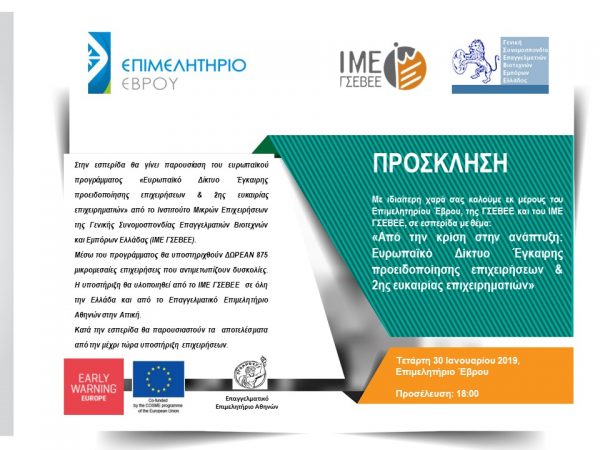 Εσπερίδα του Επιμελητηρίου Έβρου, της ΓΣΕΒΕΕ και του ΙΜΕ ΓΣΕΒΕΕ «Από την κρίση στην ανάπτυξη: Ευρωπαϊκό Δίκτυο Έγκαιρης προειδοποίησης επιχειρήσεων & 2ης ευκαιρίας επιχειρηματιών»
