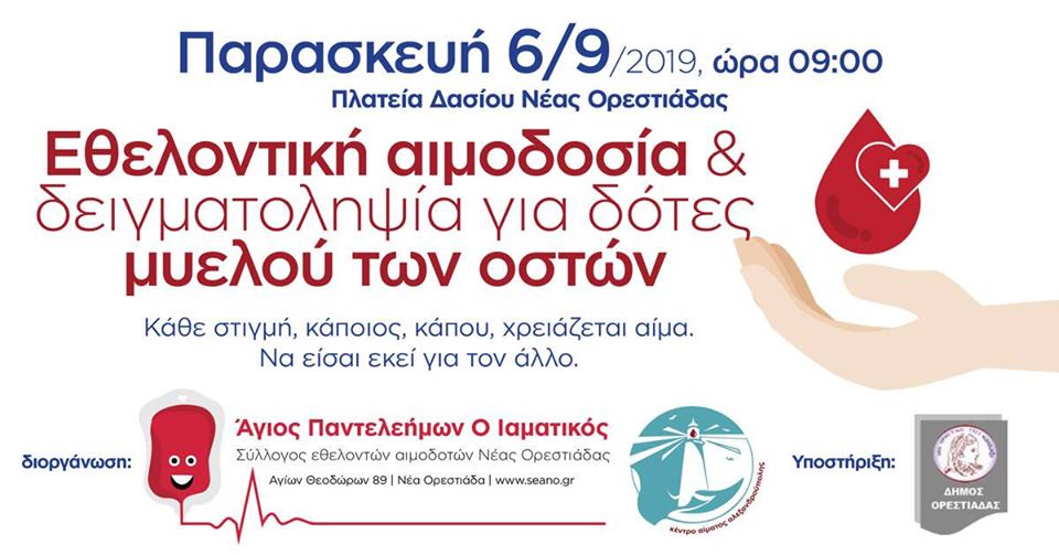 Ο σύλλογος εθελοντών αιμοδοτών Νέας Ορεστιάδας «Άγιος Παντελεήμων ο Ιαματικός», διοργανώνει εθελοντική αιμοδοσία και δειγματοληψία μυελού των οστών, η οποία θα πραγματοποιηθεί την Παρασκευή 6/9/2019 και ώρα 9:00, στην πλατεία Δασίου Νέας Ορεστιάδας, από την κινητή μονάδα αιμοληψίας του Γενικού Πανεπιστημιακού Νοσοκομείου Αλεξανδρούπολης.