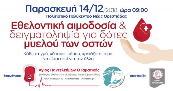 Η αιμοληψία θα πραγματοποιηθεί την Παρασκευή 14 Δεκεμβρίου 2018 και ώρα 9:00, στο Πολιτιστικό πολύκεντρο Νέας Ορεστιάδας.