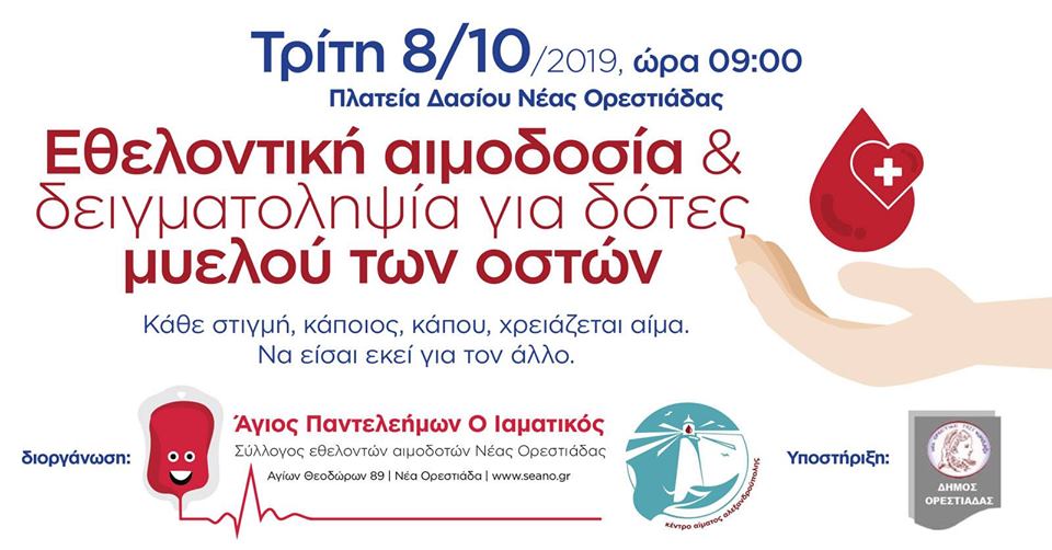 Ο σύλλογος εθελοντών αιμοδοτών Νέας Ορεστιάδας «Άγιος Παντελεήμων ο Ιαματικός», διοργανώνει εθελοντική αιμοδοσία και δειγματοληψία μυελού των οστών, η οποία θα πραγματοποιηθεί την Τρίτη 8/10/2019 και ώρα 9:00, στην πλατεία Δασίου Νέας Ορεστιάδας, από την κινητή μονάδα αιμοληψίας του Γενικού Πανεπιστημιακού Νοσοκομείου Αλεξανδρούπολης.