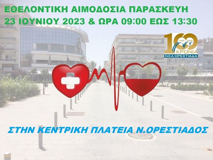 Η εθελοντική αιμοδοσία θα λάβει χώρα την Παρασκευή 23 Ιουνίου 2023 από τις 09:00 έως 13:30 στην Κεντρική πλατεία Ορεστιάδας – Πλατεία Δασίου.
