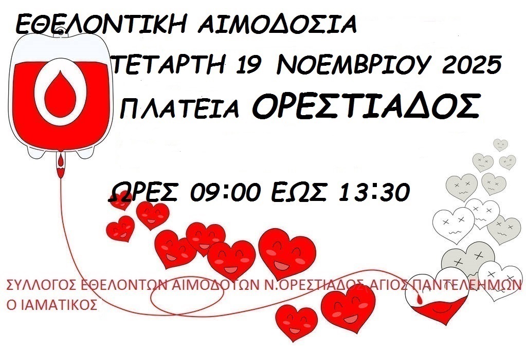 Ο Σύλλογος Εθελοντών Αιμοδοτών «Άγιος Παντελεήμων ο Ιαματικός» σας προσκαλεί σε εθελοντική αιμοδοσία που θα πραγματοποιηθεί την Τετάρτη 19 Νοεμβρίου, στην Κεντρική Πλατεία του Δήμου Ορεστιάδας, από 09:00 π.μ. έως 13:30 μ.μ.