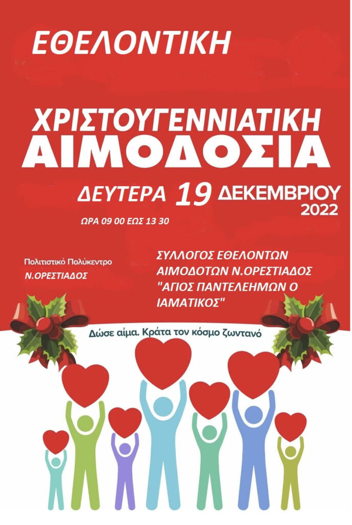 Η Χριστουγεννιάτικη Αιμοδοσία του Συλλόγου Εθελοντών Αιμοδοτών Ν. Ορεστιάδας “Άγιος Παντελεήμων ο Ιαματικός” θα πραγματοποιηθεί τη Δευτέρα 19 Δεκεμβρίου και ώρες 09:00-13:30 στο Πολιτιστικό Πολύκεντρο τη ΔΗ.Κ.Ε.Π.Α.Ο., με ευχές από το Σύλλογο για “Καλά Χριστούγεννα & Καλή χρόνια”!