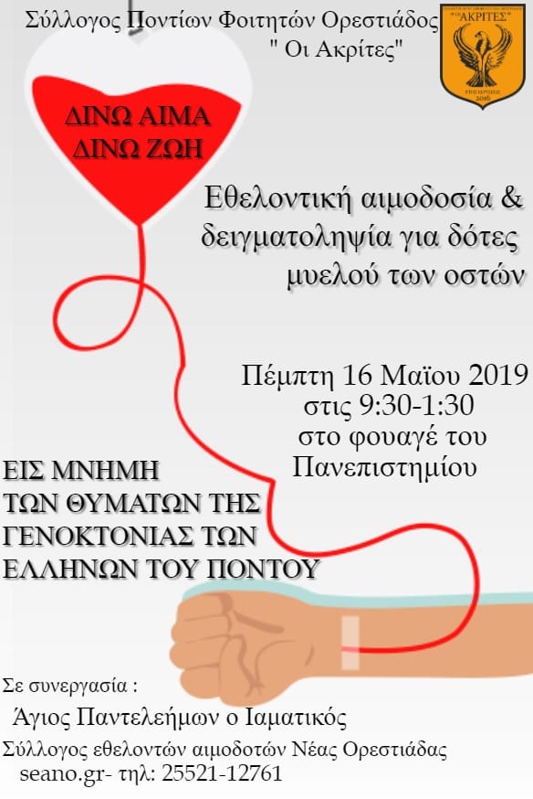 Ο Σύλλογος Ποντίων Φοιτητών Ορεστιάδος «Οι Ακρίτες» με αφορμή το αίμα που χάθηκε απο τα αδικοχαμένα θύματα της Γενοκτονίας των Ελλήνων του Πόντου (1919-2019) σε συνεργασία με τον Σύλλογο εθελοντών αιμοδοτών Νέας Ορεστιάδας Άγιος Παντελεήμων ο Ιαματικός διοργανώνει Εθελοντική αιμοδοσία και δειγματοληψία για δότες μυελού των οστών, την Πέμπτη 16 Μαΐου 2019 στις 9:30-13:30 στο φουαγέ του Πανεπιστημίου.