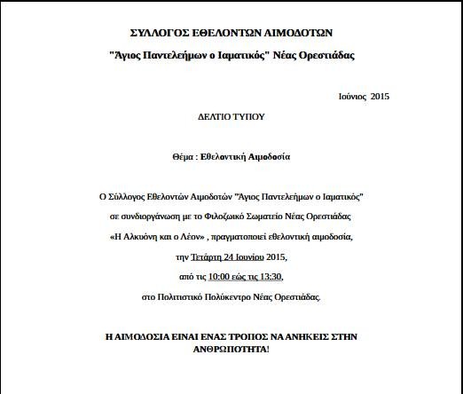 Εθελοντική αιμοδοσία: Ο Σύλλογος εθελοντών αιμοδοτών Νέας Ορεστιάδας “Άγιος Παντελεήμων ο Ιαματικός” σε συνδιοργάνωση με το Φιλοζωικό Σωματείο Νέας Ορεστιάδας “Η Αλκυόνη και ο Λέον”, πραγματοποιεί εθελοντική αιμοδοσία, την Τετάρτη 24 Ιουνίου 2015 από τις 10:00 μέχρι τις 13:30 στο Πολιτιστικό Πολύκεντρο Ορεστιάδας.