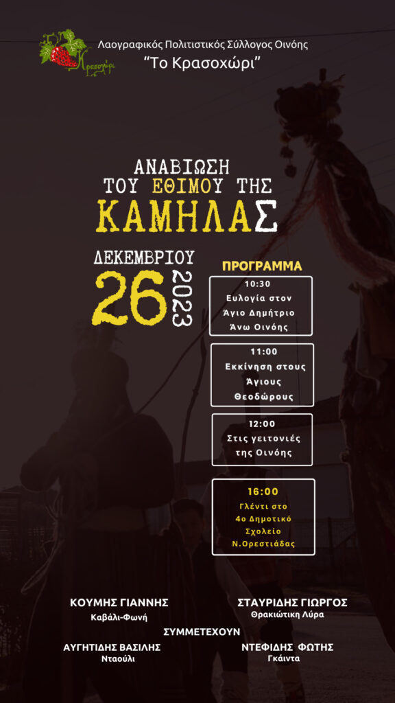 O Λαογραφικός Πολιτιστικός Σύλλογος Οινόης “ To Κρασοχώρι “ διοργανώνει τη δεύτερη μέρα των Χριστουγέννων στις 26.12.2023 την αναβίωση του εθίμου της Καμήλας. Το έθιμο ξεκινάει από το πρωί με ευλογία στον Άγιο Δημήτριο Οινόης Ορεστιάδας στη συνέχεια περιφέρεται στους δρόμους της πόλης Ορεστιάδας και τις γειτονιές της Οινόης και καταλήγει στο 4ο Δημοτικό Σχολείο Ορεστιάδας με παραδοσιακό γλέντι υπό τους ήχους ζωντανής μουσικής.