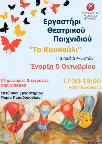 Το εργαστήρι απευθύνεται σε παιδιά από 4 ετών και θα πραγματοποιείται κάθε Παρασκευή 17:30-19:00 στον πολυχώρο του Εθνολογικού Μουσείου Θράκης.