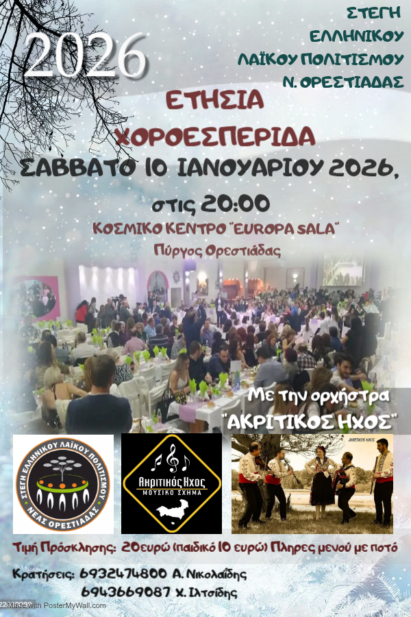 Το ΔΣ της Στέγης Ελληνικού Λαϊκού Πολιτισμού Νέας Ορεστιάδας, σας προσκαλεί στον ετήσιο χορό της, το Σάββατο 10 Ιανουαρίου 2026, στις 20:00, στο κοσμικό κέντρο “Europa Sala” στον Πύργο Ορεστιάδας.